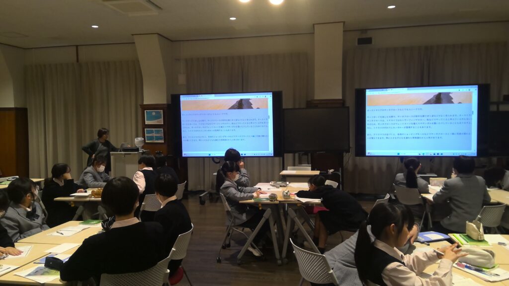 中学1年生は、1日目に英単語を学びながらカードゲームやビンゴゲームを楽しみました。また、外国のクリスマス習慣について話を聞き、日本・オーストラリア・アメリカのクリスマスの違いを比較しました。