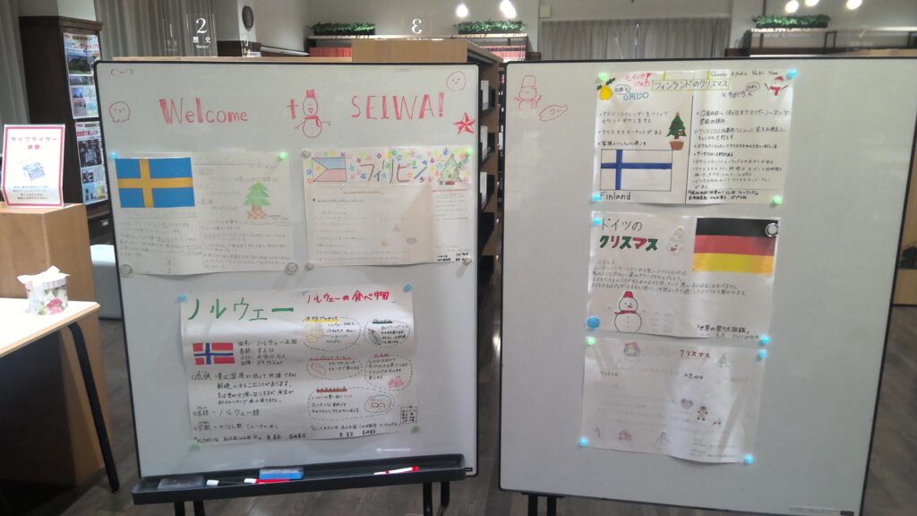 2日目には、図書館で外国のクリスマス習慣について調べ学習を行い、ポスターを作成しました。その後、英語でのインタビューに挑戦し、最後にはクリスマスクッキーのデコレーションやクリスマス映画の鑑賞を楽しみました。これら2日間の活動を通して、生徒たちは英語学習と異文化理解に積極的に取り組み、楽しく学ぶことができました。