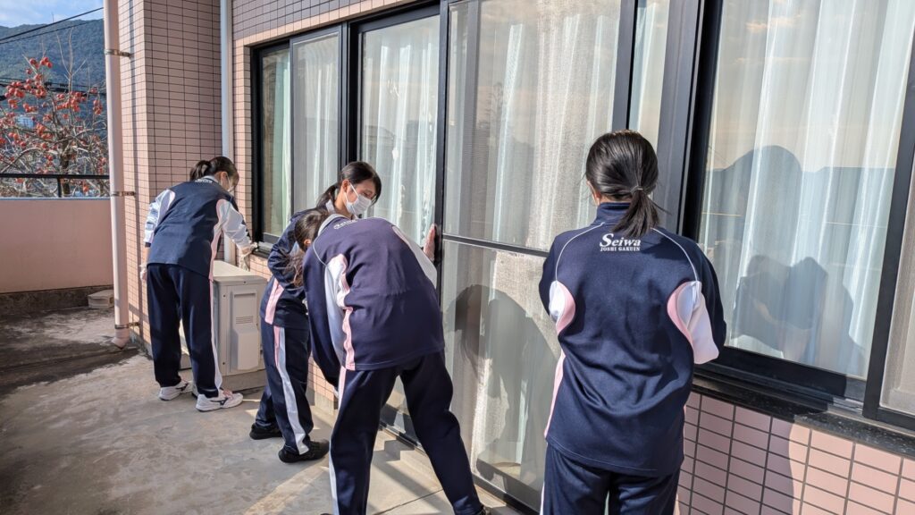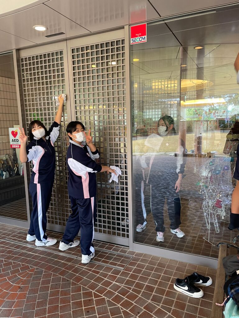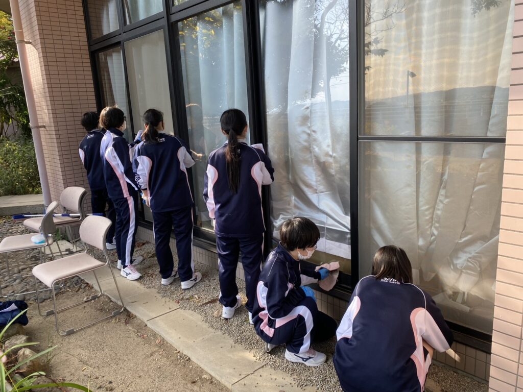 高校1学年は「特別養護老人ホーム あそかのもり」を訪問し、清掃活動及び歌の出し物を行いました。