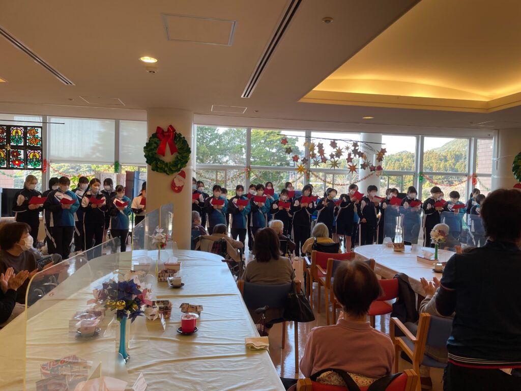 高校1学年は「特別養護老人ホーム あそかのもり」を訪問し、清掃活動及び歌の出し物を行いました。