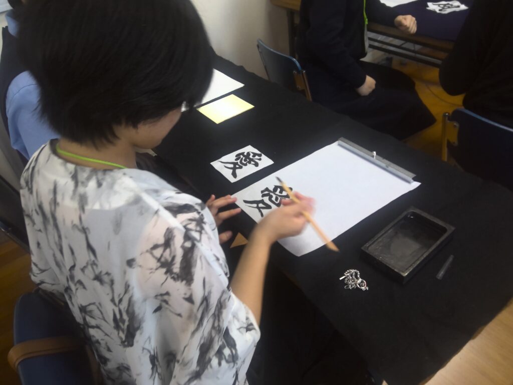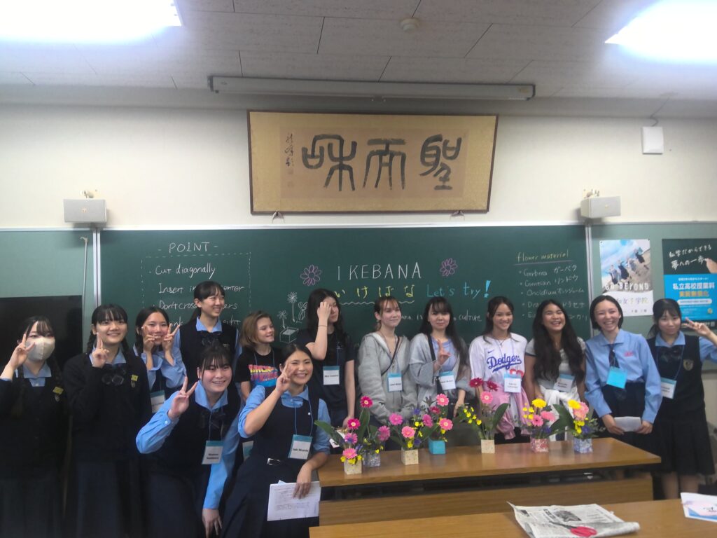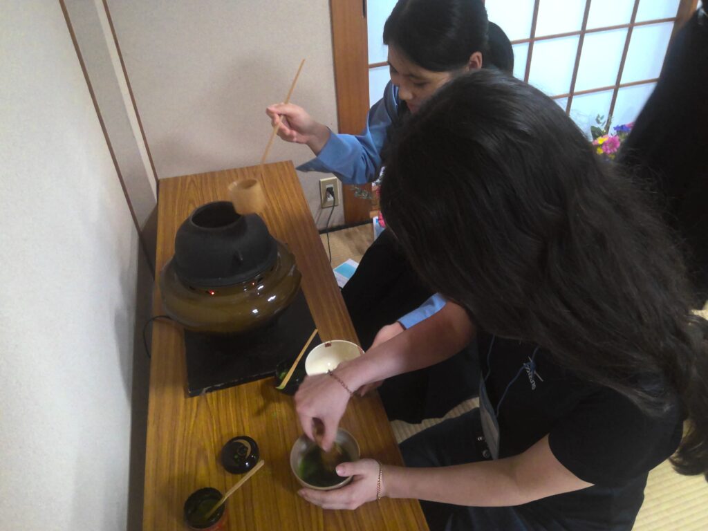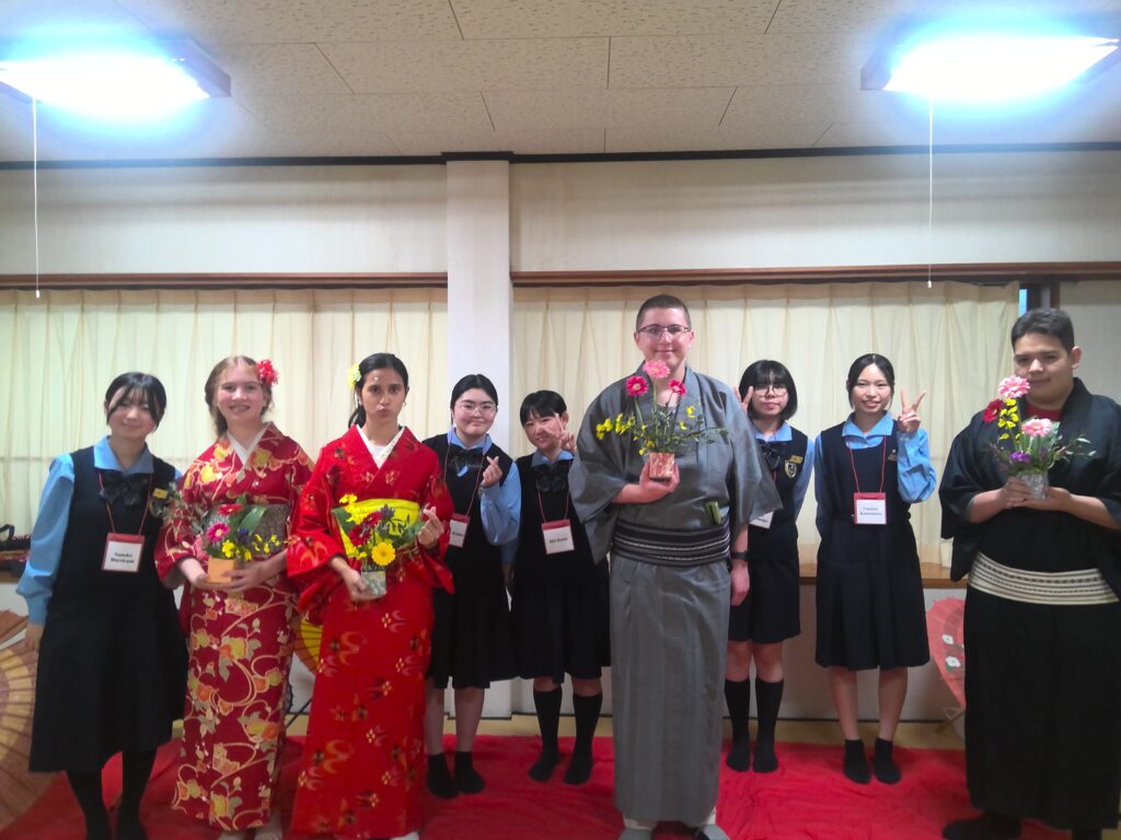 その後、華道、茶道、書道、着物の着付けといった日本文化を体験しました。生徒がバディとなって、体験のお手伝いをしてくれました。また、部活動の生徒も準備などのお手伝いをしてくれました。