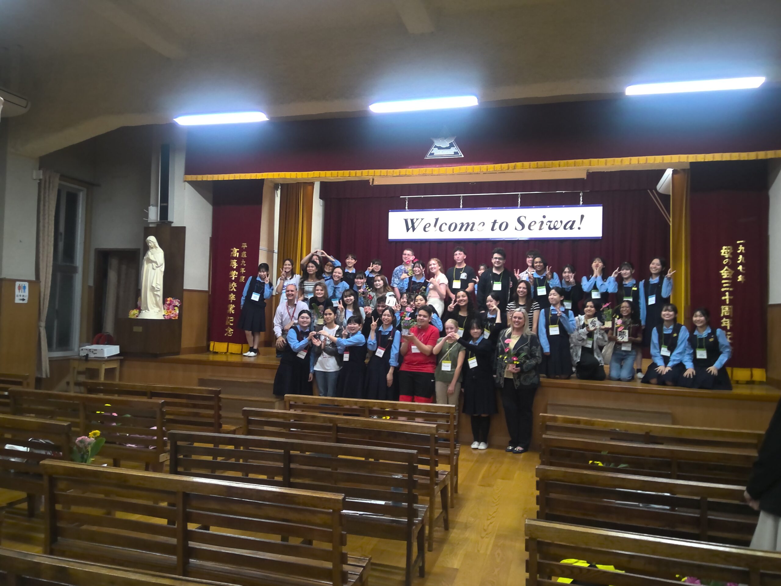 最後に再び講堂に戻り、クロージングセレモニーを行いました。生徒も、来校した学生たちも名残惜しそうにしており、バスに乗る前までずっと話をしたりしていました。バスに乗って出発するときも、声をかけてお見送りしていました。